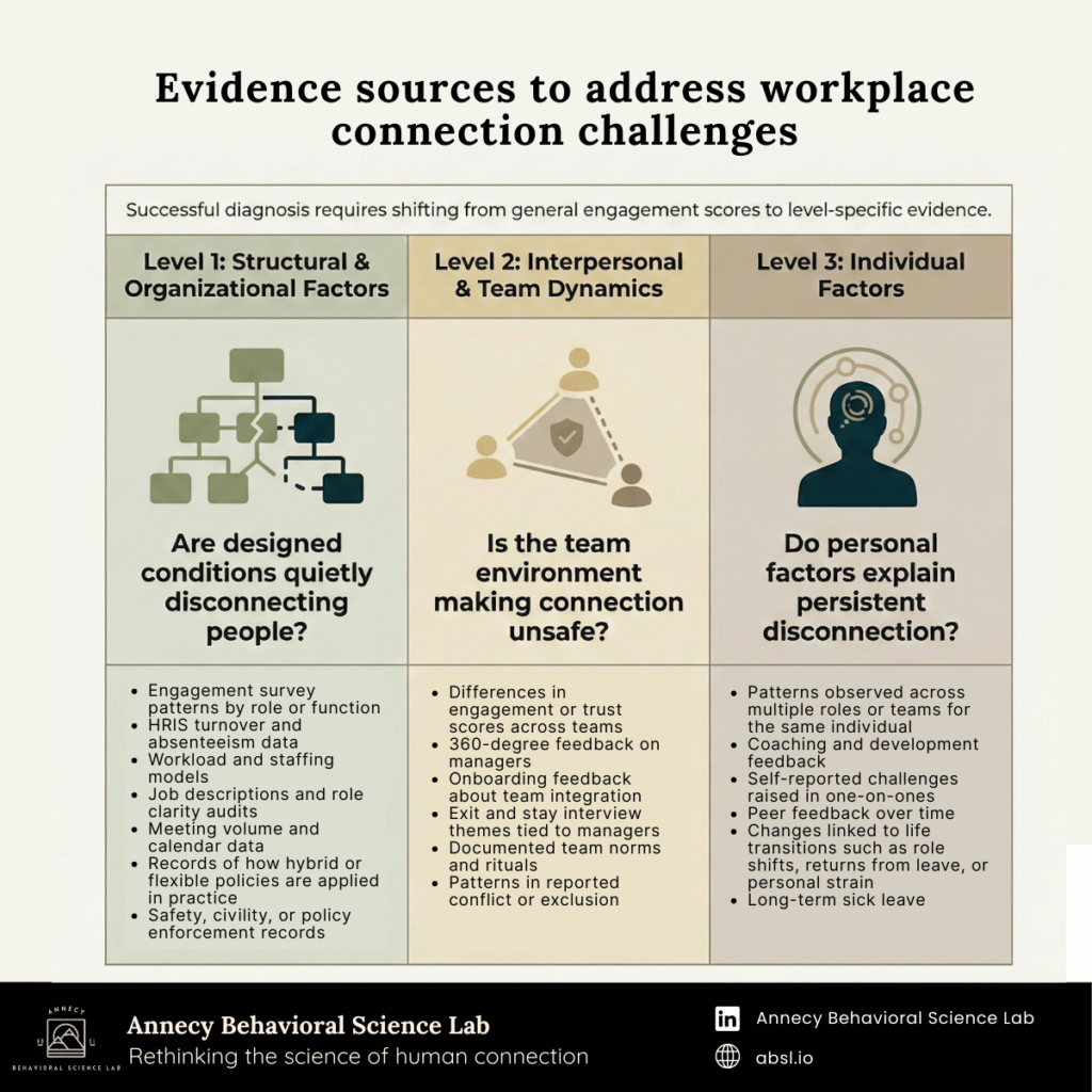 By diagnosing at the correct level, organizations can target the connection dimensions most likely to shift and avoid spreading effort across interventions that do not match the problem.